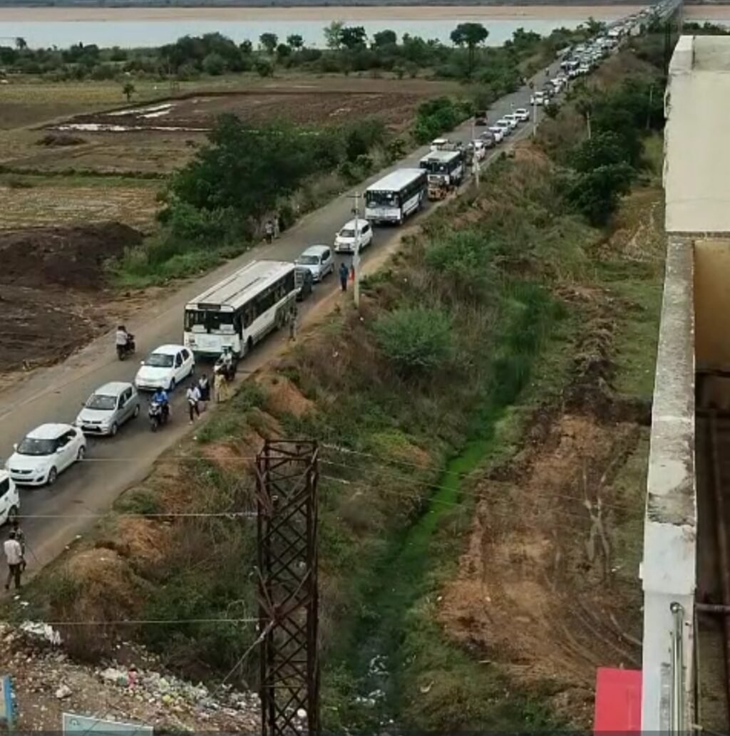 ఆకేరున్యూస్, కాళేశ్వరం: రాష్ట్ర ప్రభుత్వం కాలేశ్వర క్షేత్రంలో అత్యంత ప్రతిష్టాత్మకంగా చేపడుతున్న సరస్వతీ పుష్కరాలకు పదవరోజు శనివారం భక్తులు అధికంగా రావడంతో మహాదేవపూర్ కాళేశ్వరం రహదారిలో సుమారు తొమ్మిది కిలోమీటర్ల మేర భారీగా ట్రాఫిక్ జాం ఏర్పడిరది.శుక్రవారం రాత్రి కురిసిన వర్షానికి కాళేశ్వర క్షేత్రంలోని పార్కింగ్ స్థలాలన్నీ బురదమయం కావడంతో భక్తులు తీవ్ర ఇబ్బందులను ఎదుర్కొన్నారు. దీంతో రంగంలోకి దిగిన భూపాల్ పల్లి జిల్లా కలెక్టర్ రాహుల్ శర్మ, ఎస్పీ కిరణ్ ఖరే లు యుద్ధ ప్రాతిపదికన కొన్ని చర్యలు చేపట్టారు. శనివారం వేలాది వాహనాలు లక్షల మంది భక్తులు తరలిరావడంతో భారీగా ట్రాఫిక్ జామ్ ఏర్పడిరది. ప్రత్యక్షంగా ఎస్పీ కిరణ్ ఖరే కాలినడకన ఏఎస్పీలు చేతన్ నితిన్, రాహుల్ రెడ్డి, మహదేవపూర్ సిఐ రామచందర్ రావు తో కలిసి కాళేశ్వరం నుండి అన్నారం క్రాస్ వరకు సుమారు 7 కిలోమీటర్లు వర్షంలో తడుస్తూ సిబ్బందికి వాకి టాకీ ద్వారా సూచనలిస్తూ ట్రాఫిక్ నియంత్రణకు కృషి చేశారు. ఈ సందర్భంగా ఎస్పీ మాట్లాడుతూ మరో రెండు రోజులు భక్తుల తాకిడి మరింతగా ఉండే అవకాశాలు ఉన్నాయని సిబ్బంది అప్రమత్తంగా ఉండి భక్తులకు ఎలాంటి ఇబ్బందులు చోటు చేసుకోకుండా ప్రమాదాలు జరగకుండా సురక్షిత ప్రయాణాలు జరిగేలా చర్యలు తీసుకోవాలని ఆయన సూచించారు.