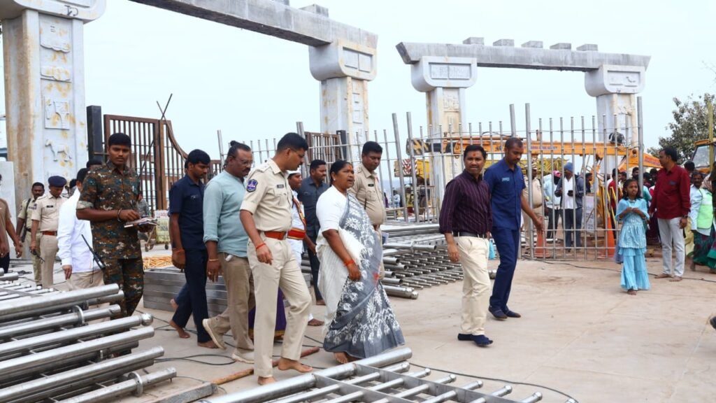అనంతరం మంత్రి సీతక్క ఆలయ ప్రాంగణ అభివృద్ధి పనులను, ఫ్లోరింగ్ పనులను, క్యూ లైన్ షేడ్స్ నిర్మాణాలను పరిశీలించి త్వరిత గతిన పూర్తి చేయాలని సంబధిత అధికారులను ఆదేశించారు. ఈ సందర్భంగా మంత్రి మాట్లాడుతూ సెలవు దినాల లో భక్తుల రద్దీ ఎక్కువగా ఉంటుందని ఎలాంటి ఇబ్బందులు లేకుండా దర్శనం కలిగే విధంగా చూడాలని అన్నారు. రాష్ట్ర ముఖ్య మంత్రి చేతుల మీదుగా గద్దెల పునః ప్రారంభం చేయడం జరుగుతుందని పనులను త్వరితగతిన పూర్తి చేయాలని అన్నారు. గద్దెల ప్రాంగణం విద్యుత్ కాంతుల వెలుగులతో ఆకర్షవంతగా కనిపించడం కోసం నూతన ఆధునిక విద్యుత్ దీపాలను అమర్చడం జరిగిందని తెలిపారు. ఈ కార్యక్రమంలో మార్కెట్ కమిటీ చైర్మన్ రేగ కళ్యాణి, ఆలయ పూజారులు, గుత్తేదారులు ఇతర అధికారులు తదితరులు పాల్గొన్నారు.