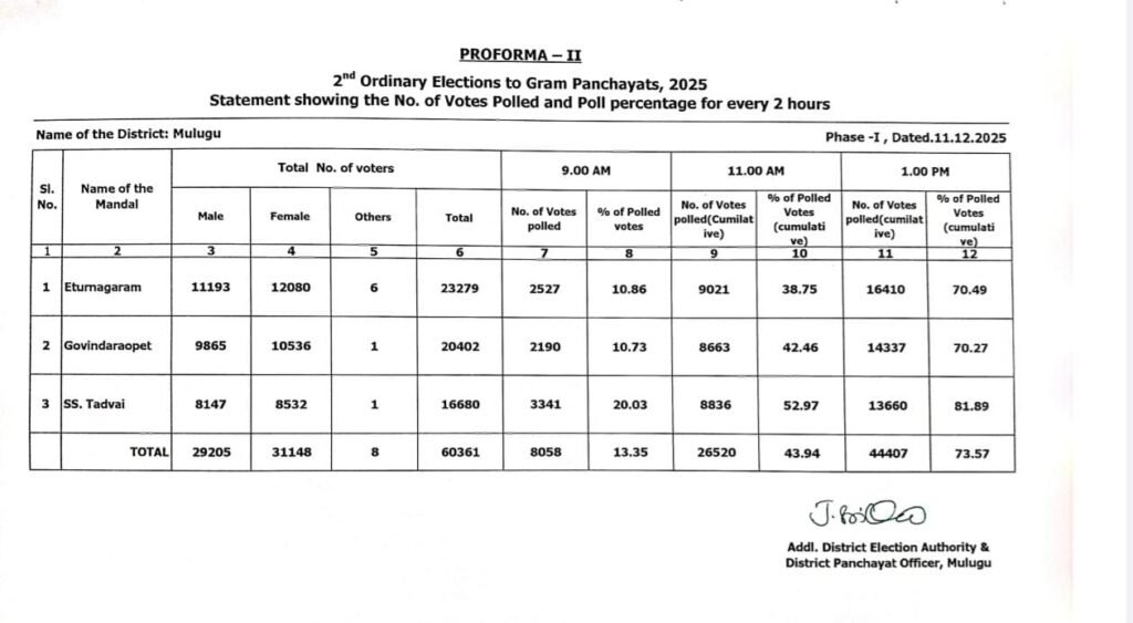 ఆకేరు న్యూస్, ములుగు: మొదటి విడత పంచాయతీ ఎన్నికలలో 73.57% పోలింగ్ జరిగింది. ములుగు జిల్లాలో గోవిందరావుపేట, తాడువాయి, ఏటూర్ నాగారం మండలాల్లో గ్రామ పంచాయతీ ఎన్నికలు నిర్వహించారు. ఇందులో ఏటూర్ నాగారంలో 70.49 శాతం, గోవిందరావుపేటలో 70.27, తాడువాయి 81. 89% పోలింగ్ నమోదు అయింది. అత్యధికంగా మండలం తాడ్వాయి మండలములో పోలింగ్ జరిగింది. ఏదేమైనప్పటికీ ఏజెన్సీ ప్రాంతమైన ములుగు జిల్లాలో మొదటి విడత ఎన్నికలు ప్రశాంతంగా ముగిశాయి.