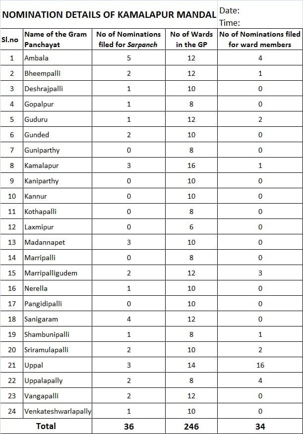 ఆకేరు న్యూస్, కమలాపూర్ : స్థానిక ఎన్నికల నామినేషన్ల ప్రక్రియ నిన్న ప్రారంభం కాగా మండలంలోని 24 గ్రామాలు 246 వార్డులు ఉండగా… ఎంపీడీవో గుండె బాబు తెలిపిన వివరాల ప్రకారం….సర్పంచ్ కి అత్యధికంగా అంబాలలో సర్పంచ్ కి 5 నామినేషన్లు, కమలాపూర్, ఉప్పల్, మాదన్నపేటలో 3,వంగపల్లి, శ్రీరాములపల్లి,ఉప్పల్ పల్లి, మరిపెళ్లి గూడెం, గుండేడు, భీంపల్లి గ్రామాల్లో 2, దేశరాజు పల్లి, గూడూరు, గోపాల్ పూర్, నేరెళ్ల , శంభునిపల్లి, వెంకటేశ్వర్ల పల్లి లో 1 చొప్పున సర్పంచ్ కి నామినేషన్లు దాఖలు అయ్యాయి. మిగిలిన దేశ రాజ్పల్లి , గోపాల్పూర్ , కానిపర్తి, కన్నూరు, కొత్తపల్లి, లక్ష్మీపూర్, మర్రిపల్లి, పంగిడిపల్లి గ్రామాలలో సర్పంచ్ కి ఒక్క నామినేషన్ కూడా దాఖలు కాలేదు. ఉప్పల్ మేజర్ గ్రామపంచాయతీలో 14 వార్డులకు గాను అత్యధికంగా 16 నామినేషన్లు దాఖలు అయ్యాయి.అంబాల , ఉప్పల్ పల్లిలో 4, మరిపల్లిగూడెంలో 3,శ్రీరాములపల్లి గూడూరులో 2,కమలాపూర్,భీంపల్లి,శంభునిపల్లిలో ఒక్కటి చొప్పున వార్డు నెంబర్ కి నామినేషన్లు నమోదు అయ్యాయి.