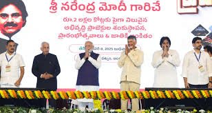 ఆకేరున్యూస్, అమరావతి: ఏపీ ప్రజల చిరకాల స్వప్నం అమరావతి సాకారం కాబోతుందని ప్రధాని మోడీ అన్నారు. అమరావతి ఒక పుణ్యభూమి అని.. నేను ఈ పుణ్యభూమిపై నిలబడి విూ అందరితో మాట్లాడటం ఆనందంగా ఉందన్నారు. అమరావతి పునఃనిర్మాణ పనులకు శంకుస్థాపనలు, ప్రారంభోత్సవాలు చేసిన అనంతరం ప్రధాని మోదీ ప్రసంగించారు. తన ప్రసంగాన్ని తెలుగులో మొదలుపెట్టిన ప్రధాని.. దుర్గాభవానీ కొలువైన ఈ పుణ్య భూమిలో మిమ్మల్ని కలవడం ఆనందంగా ఉందన్నారు. తన ప్రసంగం మధ్యమధ్యలో తెలుగులో మాట్లాడుతూ ఆకట్టుకున్నారు. ఇవాళ దాదాపు రూ.60 వేల కోట్ల పనులకు శంఖుస్థాపనలు చేశా.. అయితే ఇవి కేవలం శంఖుస్థాపనలే కాదు.. ఏపీ ప్రగతికి, వికసిత్ భారత్కు బలమైన పునాదులని పేర్కొన్నారు. శుక్రవారం వెలగపూడిలో అమరావతి పునర్నిర్మాణ పనులను మోడీ ప్రారంభించారు. మొత్తం 18 ప్రాజెక్టులకు ఆయన శంకుస్థాపన చేశారు. మోడీ చేతుల విూదుగా అమరావతి పునర్నిర్మాణ పనులు ప్రారంభమయ్యాయి. ఈ సందర్భంగా ఏర్పాటు చేసిన సభలో మోడీ మాట్లాడుతూ.. ఏఐ, ఐటీ, ఎడ్యుకేషన్, హెల్త్ ఇలా అన్ని రంగాల్లో అమరావతి కీలకంగా మారబోతుందని అన్నారు. అమరావతి ప్రతి వ్యక్తి కలల నిర్మాణమని.. త్వరలోనే వారి స్వప్నం సాకారం కాబోతుందన్నారు. ఉమ్మడి ఏపీలో చంద్రబాబు ఐటీ విజన్ అద్భుతమని.. ఆయన ఐటీ విజన్ను నేను అప్పుడు గుజరాత్ సీఎంగా ఉండి పరిశీలించానని తెలిపారు. నాణ్యమైన ప్రాజెక్టులు వేగంగా పూర్తి చేయాలంటే చంద్రబాబు తర్వాతే ఎవరైనా అని ప్రశంసించారు. 2015లో అమరావతి నిర్మాణానికి నేనే శంఖుస్థాపన చేశా.. పదేండ్లు ఏపీ అభివృద్ధి కోసం సహకరించామని పేర్కొన్నారు. అమరావతిలో అన్ని రకాల నిర్మాణాలకు కేంద్రం తోడ్పాడుతుందన్నారు. వీరభద్ర స్వామి, అమరలింగేశ్వరస్వామి, తిరుపతి వెంకటేశ్వరస్వామికి పాదాలకు నమస్కరిస్తూ ఏపీ ప్రజలకు హృదయపూర్వక శుభాకాంక్షలు. చంద్రబాబు, పవన్కు ప్రత్యేక కృతజ్ఞతలు చెబుతున్నానని అన్నారు. అమరావతిలో మౌలికవసతుల కల్పనకు కేంద్ర సహకరిస్తుందని చెప్పారు. ఏపీలో కనెక్టివిటీకి కొత్త అధ్యాయం మొదలవుతుంది. రైల్వే ప్రాజెక్టులతో ఒక జిల్లా నుంచి మరో జిల్లాకు, మరో రాష్టాన్ర్రికి అనుసంధానం పెరుగుతుంది. ఈ అనుసంధానం తీర్థయాత్రలకు పర్యాటకాభివృద్ధికి ఉపయోగపడుతుంది. ఒకప్పుడు తెలుగు రాష్టాల్రకు రైల్వే బడ్జెట్ రూ.900 కోట్ల లోపే ఉండేది. ఇప్పుడు కేవలం ఏపీకే రూ.9వేల కోట్ల రైల్వే నిధులు ఇచ్చాం. ఏపీకి గతం కంటే పది రెట్లు అధికంగా నిధులు కేటాయించామన్నారు. అనంతరం ఏపీ సీఎం చంద్రబాబు మాట్లాడుతూ.. మూడేళ్లలో అమరావతి పనుల్ని పూర్తి చేస్తామన్నారు. ఆ పనులు పూర్తయ్యాక ఏపీ జీడీపీ ఏ స్థాయికి వెళ్తుందో నేను ఊహించగలనని.. అది ఏపీ రాష్ట్రం చరిత్ర గతిని మార్చబోతోందని పేర్కొన్నారు. ఈ కార్య